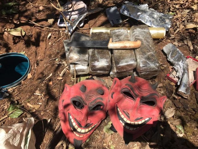 No local, os PMs encontraram dentro de um tambor duas balanças de precisão, uma faca, duas máscaras, doze tabletes de maconha que somados pesaram 7,518 Kg e diversas embalagens de filme plástico e papel alumínio.