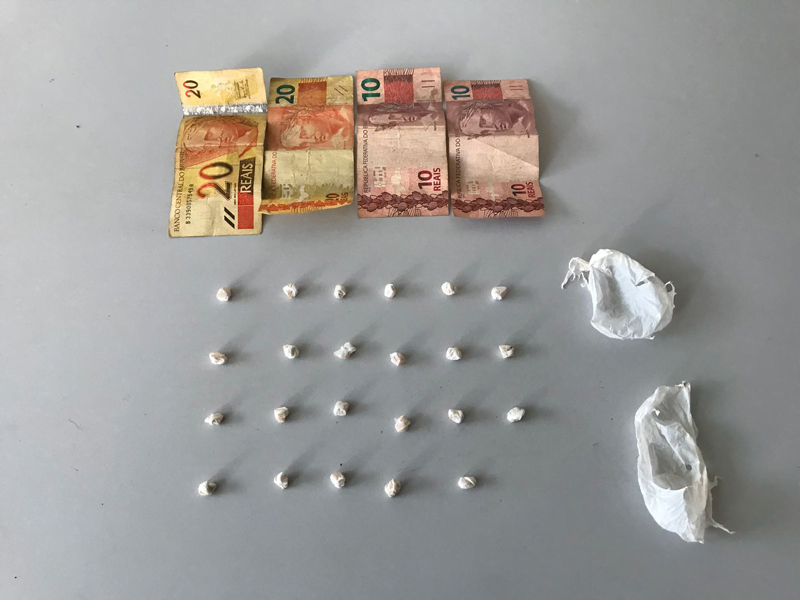 Diante dos fatos a equipe solicitou o apoio de outra viatura e foi possível abordar o indivíduo que havia enterrado algo no chão, sendo que o rapaz que trajava camisa vermelha evadiu-se em uma bicicleta. Com o rapaz foi encontrado em sua mão uma quantia em dinheiro no valor de R$ 60,00 e nada de ilícito, porém no local onde ele havia enterrado algo foram localizados dois kits contendo crack, sendo oito pedras no kit que estava aberto e mais 15 pedras no que estava fechado, todas as porções embaladas em plástico branco e prontas para comercialização.