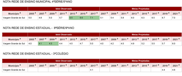 No entanto, a nota do município de Vargem Grande do Sul na rede de ensino estadual para o ensino fundamental foi de 5,0 em 2017, avaliação que ficou abaixo da média projetada para o mesmo ano, que era 5,5. As únicas avaliações que ultrapassaram as metas projetadas foram as de 2007 e 2009.
