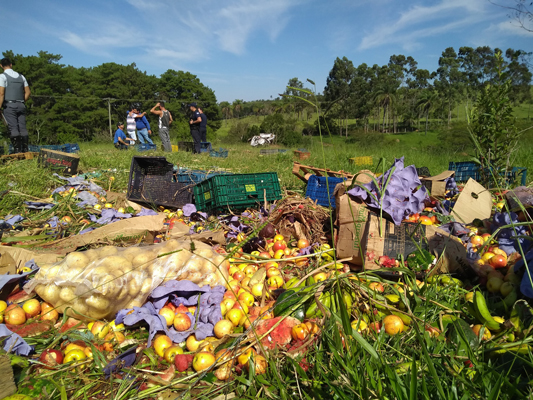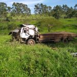 Um caminhão de Casa Branca carregado com hortifrutis ficou completamente destruído após tombar na estrada que liga Vargem Grande do Sul ao distrito de São Roque da Fartura, na manhã desta segunda-feira, dia 22 de abril.
