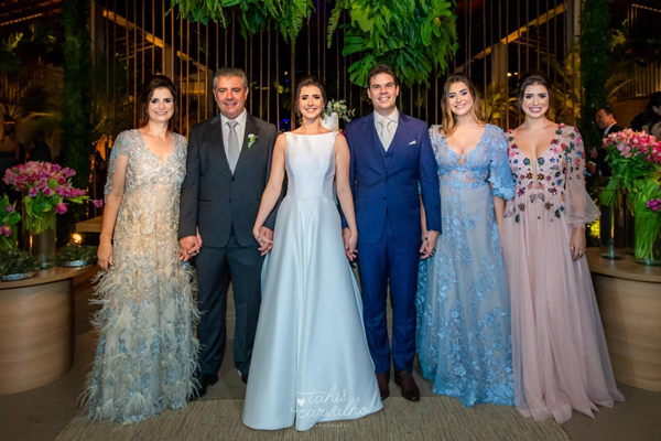 Após a cerimônia religiosa, os noivos receberam amigos, familiares e demais convidados em uma animada festa no Espaço SBB, que contou com o cardápio especial da equipe do Paulo Pirola Buffet. Rafaella dividiu a emoção com as irmãs Marcella e Isabella e Luiz Henrique com sua irmã Renatinha