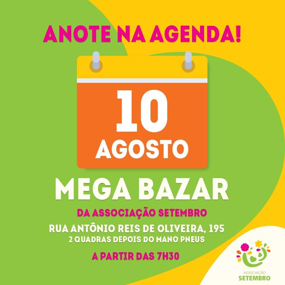 A Associação Setembro irá realizar um Mega Bazar neste sábado, dia 10. O bazar acontecerá a partir das 7h30, na Rua Antônio Reis de Oliveira, nº 195, duas quadras após a Mano Pneus.
