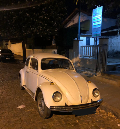 Quando os PMs seguiam para o local onde estava a vítima, no cruzamento entre as ruas Antônio Reis de Oliveira e Joaquim Antônio da Silva se depararam com um Fusca branco, o qual tiveram certeza que se tratava do objeto do furto pois os números da placa eram idênticos aos informados.