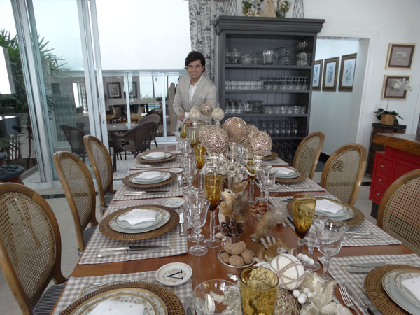 O jogo americano traz um ar mais informal e o uso de um castiçal como enfeite para o dia, deixa o visual da mesa mais despojado. Aliás, Vinícius lembra que conforme manda a etiqueta, não se usa velas durante o dia. Mas o arquiteto apostando na beleza da peça, usou o castiçal na mesa e ao invés de velas, colocou bolas de Natal. “Uma vez, usei alcachofras no lugar das velas e o resultado ficou um deslumbro”, recordou.