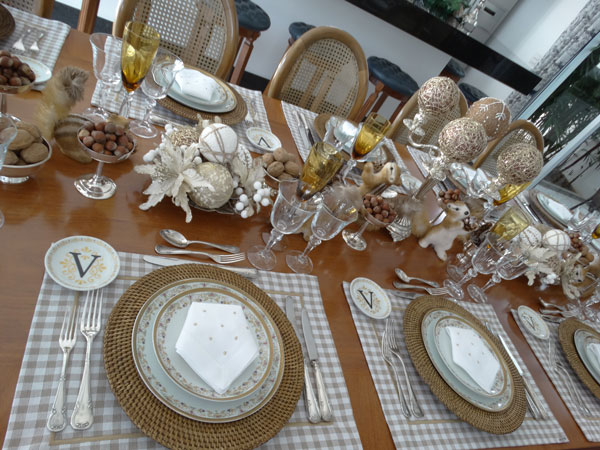Também chama a atenção os esquilos que enfeitam a mesa. “A ideia foi fugir dos tradicionais enfeites de Papai Noel ou de bico de papagaio, mas que ainda remetesse ao Natal”, explicou. A mesa foi composta em tons de terra e palha, usando muitas nozes e avelãs na decoração. Além disso, há peças personalizadas, como os pratinhos de pão, que levam o “V”, o logotipo de Vinícius.