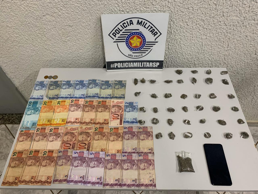 Devido a reação dos dois eles foram abordados e revistados, porém nada de ilícito encontrado em sua posse. Os PMs então localizaram a pochete dispensada por eles e em seu interior foram encontradas 39 porções de maconha prontas para a venda e uma porção maior em uma embalagem zip lock, além de R$ 337,55 dispostos em cédulas diversas e moedas.
