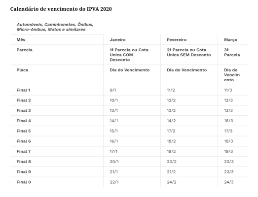 Os contribuintes podem pagar o IPVA 2020 em cota única no mês de janeiro, com desconto de 3%, ou parcelar o tributo em três vezes, de acordo com o final da placa do veículo (iniciando o primeiro pagamento em janeiro e as outras duas parcelas nos meses de fevereiro e março). Também é possível quitar o imposto no mês de fevereiro de maneira integral, sem desconto. Caminhões podem parcelar em três vezes com vencimento em março, junho e setembro.