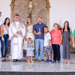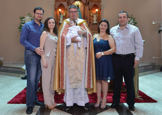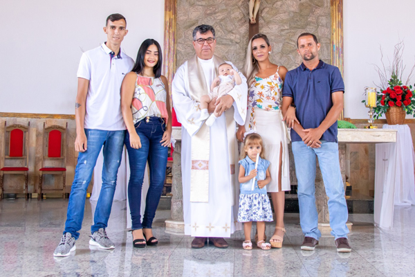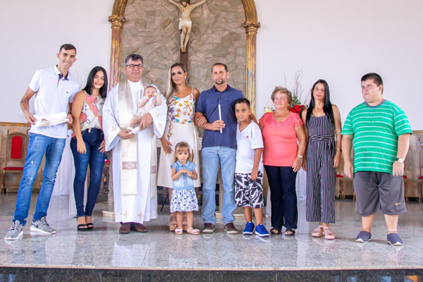 Aparecida pelos padres Luís Antônio Penna e Antônio José Carossi, tendo como padrinhos Aline de Freitas Milan e Carlos Augusto Milan. Felipe é neto de Sirlei Mari Penna Malaguti, Mário Lúcio Malaguti, Aparecida das Dores Gonçalves e Cláudio Harlei Gonçalves. Foto: Falcão Foto & Arte