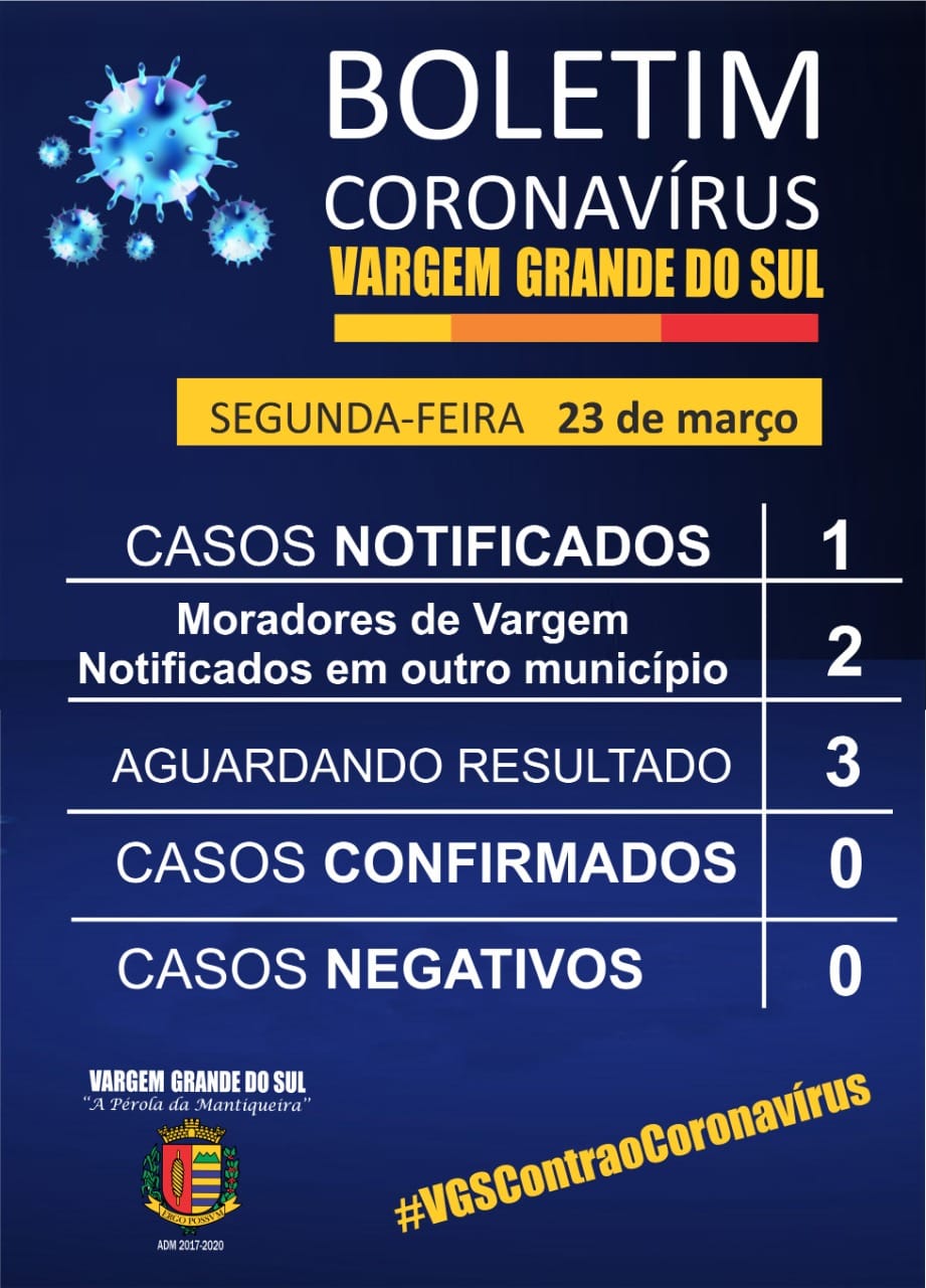 Vargem segue com três casos suspeitos, sendo um notificado na cidade e outros dois notificados em outro município. Em todo Brasil são 1.891 casos confirmados e 34 mortos.