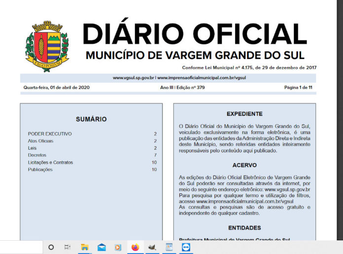 O decreto que prorroga em duas semanas prazos de vencimento de tributos devidos ao município e das tarifas de água e esgoto devidas ao Serviço Autônomo de Água e Esgoto (SAE) de Vargem Grande do Sul foi assinado pelo prefeito Amarildo Duzi Moraes (PSDB) no dia 31.