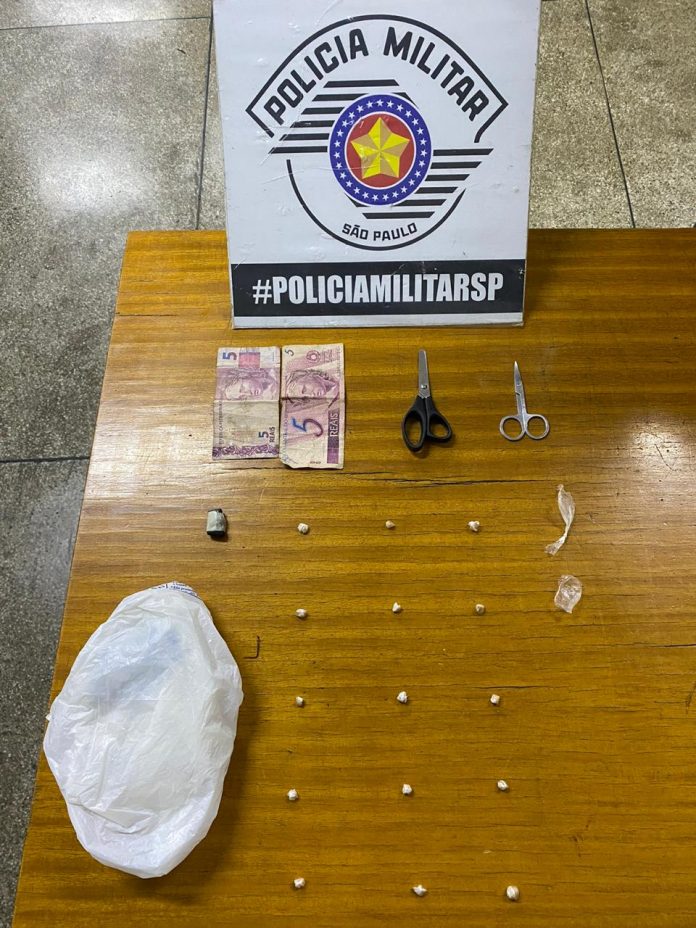 Foi feito contato com sua esposa, que alegou não ter conhecimento de droga em sua residência e acompanhou a busca e localização do kit de crack, contendo quinze porções prontas para venda no exato local indicado por ele, além de duas tesouras.