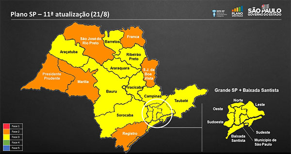 Mapa atualizado mostra a região de São João na fase laranja. Fonte: Governo do Estado