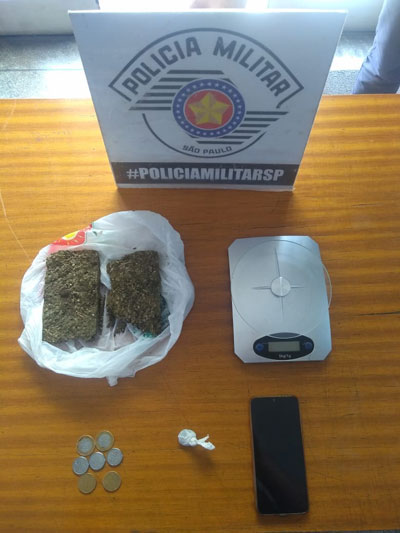 Ao avistarem os PMs, o primeiro correu para o interior do imóvel, mas foi detido. Ele permaneceu em silêncio ao ser questionado pela equipe. Foi feito contato com a sua mãe, que viu o rapaz correndo para dentro da casa. Ela autorizou a entrada dos policiais e acompanhou a localização de uma sacola plástica, com duas grandes porções de maconha, totalizando 201 g, que estava escondida dentro de um veículo estacionado na garagem.