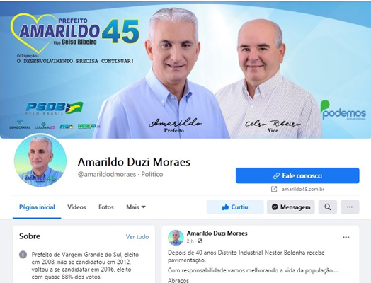 Muito mais ativo nas redes sociais, o prefeito Amarildo Duzi Moraes (PSDB), que busca a reeleição, mantém além do seu perfil pessoal criado em julho de 2015, uma página criada há 4 anos.