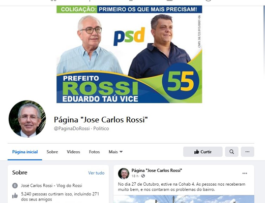 O ex-prefeito José Carlos Rossi mantém dois perfis ativos no Facebook. Em uma delas reúne cerca de 5 mil pessoas e em outra apenas 181. O perfil com mais seguidores foi criado em setembro de 2019. O perfil com menos seguidores, criado em janeiro de 2019, o candidato começou a postar apenas seus vídeos de campanha a partir de 26 de outubro.