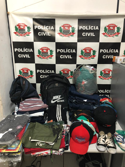 Foram apreendidas duas mochilas, um tênis infantil, um chinelo infantil, 49 bonés variados, 13 calças jeans variadas, três calças de tecido, 11 shorts tactel, 12 shorts jeans, três blusas femininas, uma camisa polo, uma cueca, 14 camisetas e cinco camisetas regatas