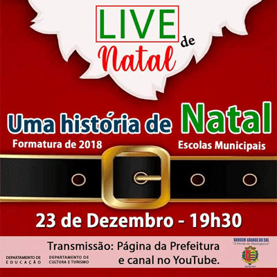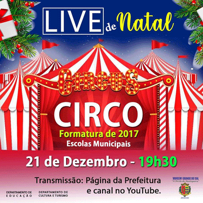 As transmissões da Live de Natal acontecerão na página da Prefeitura no Facebook e no seu canal do Youtube. Na segunda-feira, dia 21, acontece a primeira exibição. Na ocasião, será apresentada a formatura de 2017, com o tema “Circo”.