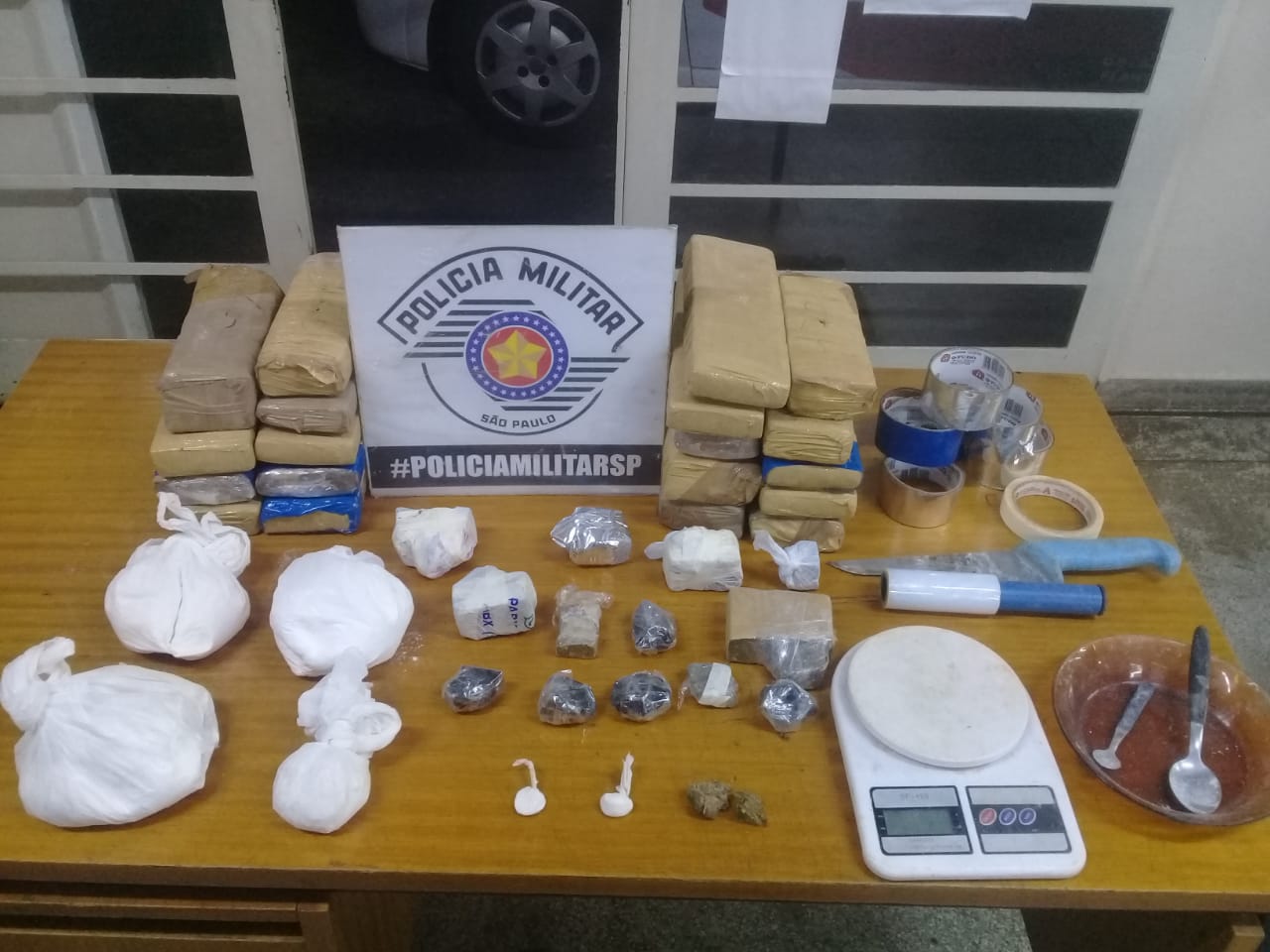Havia ainda dentro do saco 7 rolos de fita adesiva e um rolo de papel filme parcialmente usados. Os policiais permaneceram escondidos pelo local, com o objetivo de aguardar um possível retorno do proprietário dos entorpecentes. Como ninguém apareceu, os produtos e drogas apreendidos foram levados ao Plantão da Polícia Civil em São João da Boa Vista.