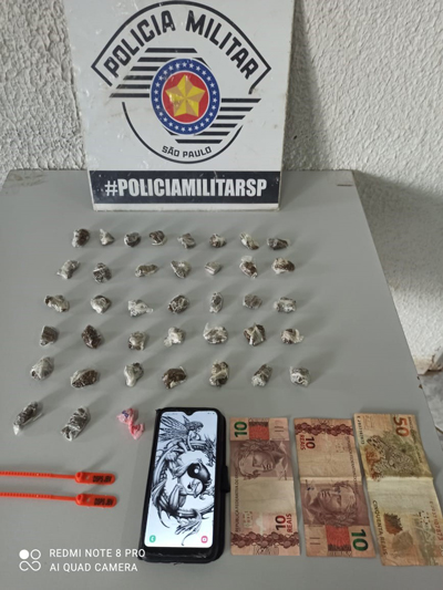 De acordo com as informações, um adolescente com aproximadamente 1,90m de altura, realizava o tráfico pelo local. Ao realizar patrulhamento, os PMs depararam com o suspeito sentado no meio da praça, que ficou nervoso ao ver a viatura policial, levantou e começou a caminhar sentido contrário à equipe, jogando algo no chão, próximo a seu pé.
