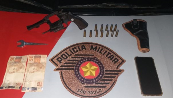 No local informado, os policiais acharam um revólver calibre 38 com a numeração suprimida, 12 munições intactas e uma chave mixa.