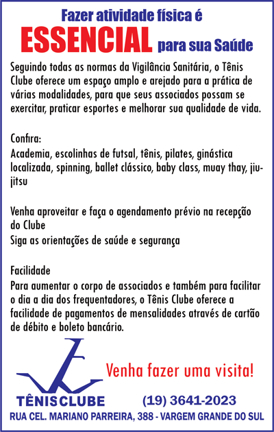 O Tênis Clube de Vargem Grande do Sul retomou uma série de ações que permaneceram suspensas devido à pandemia da Covid-19. Com a reabertura das atividades por conta da melhora dos índices da doença, muitos eventos do cronograma esportivo do clube já foram reiniciados.