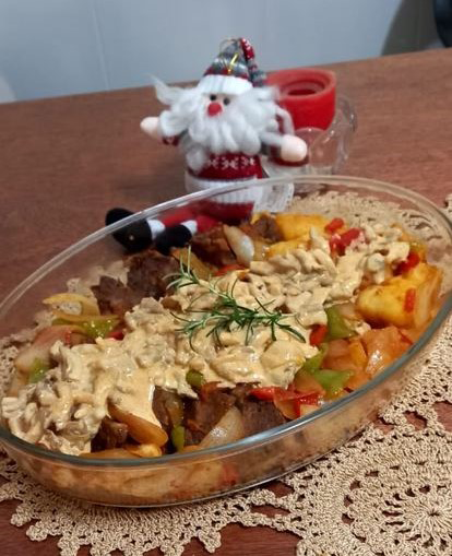 Ingredientes: 1,2 kg de maminha ou outro corte como paleta bovina ou lagarto, 3 batatas cortadas em cubos grandes, 1/2 pimentão vermelho, 1 cebola cortada a Juliane, alho, 1 tomate picado sem sementes, uma bandeja de shimeji ou outro cogumelo de sua preferência, 1/2 caixinha de creme de leite.