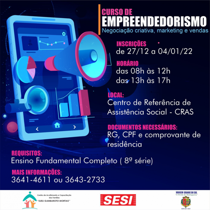Em parceria com o Centro de Capacitação das Famílias Sueli Gambaroto Mortais, o Serviço Social da Indústria (Sesi) está com as inscrições abertas para o curso de Empreendedorismo, Negociação Criativa, Marketing e Vendas, até terça-feira, dia 4.