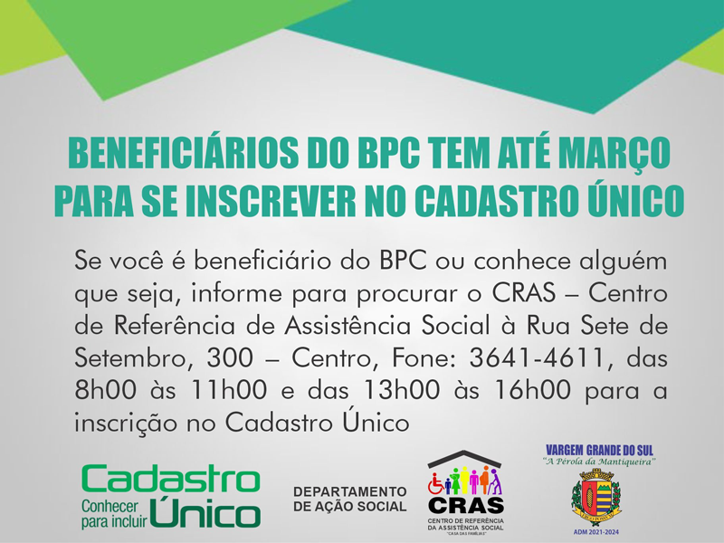 Para se cadastrar, o beneficiário do BPC deve procurar o Centro de Referência de Assistência Social (CRAS), à Rua Sete de Setembro, 300 – Centro, ou ligar no (19) 3641-4611, das 8h às 11h e das 13h às 16h para a inscrição no Cadastro Único e assim, evitar ter suspensa ou perder esta renda.