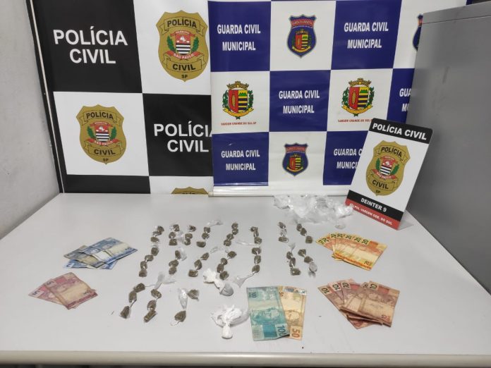 Na ocasião, o delegado, investigadores, agentes policiais e cinco guardas civis encontraram 60 porções de maconha e uma de cocaína, embaladas e prontas para a venda, além de meio tijolo de maconha, balança, dinheiro, celulares e embalagens para acondicionar as drogas.