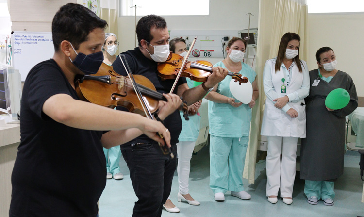 O maestro Douglas Cunha, explica que, normalmente, os concertos contam com dezenas de integrantes da Orquestra, porém, para a celebração no hospital, foi necessário fazer uma adaptação e quatro músicos tocaram. “Nossa intenção é levar a música de maneira sutil e agradável, tanto para os pacientes internados e acompanhantes quanto para os profissionais”.