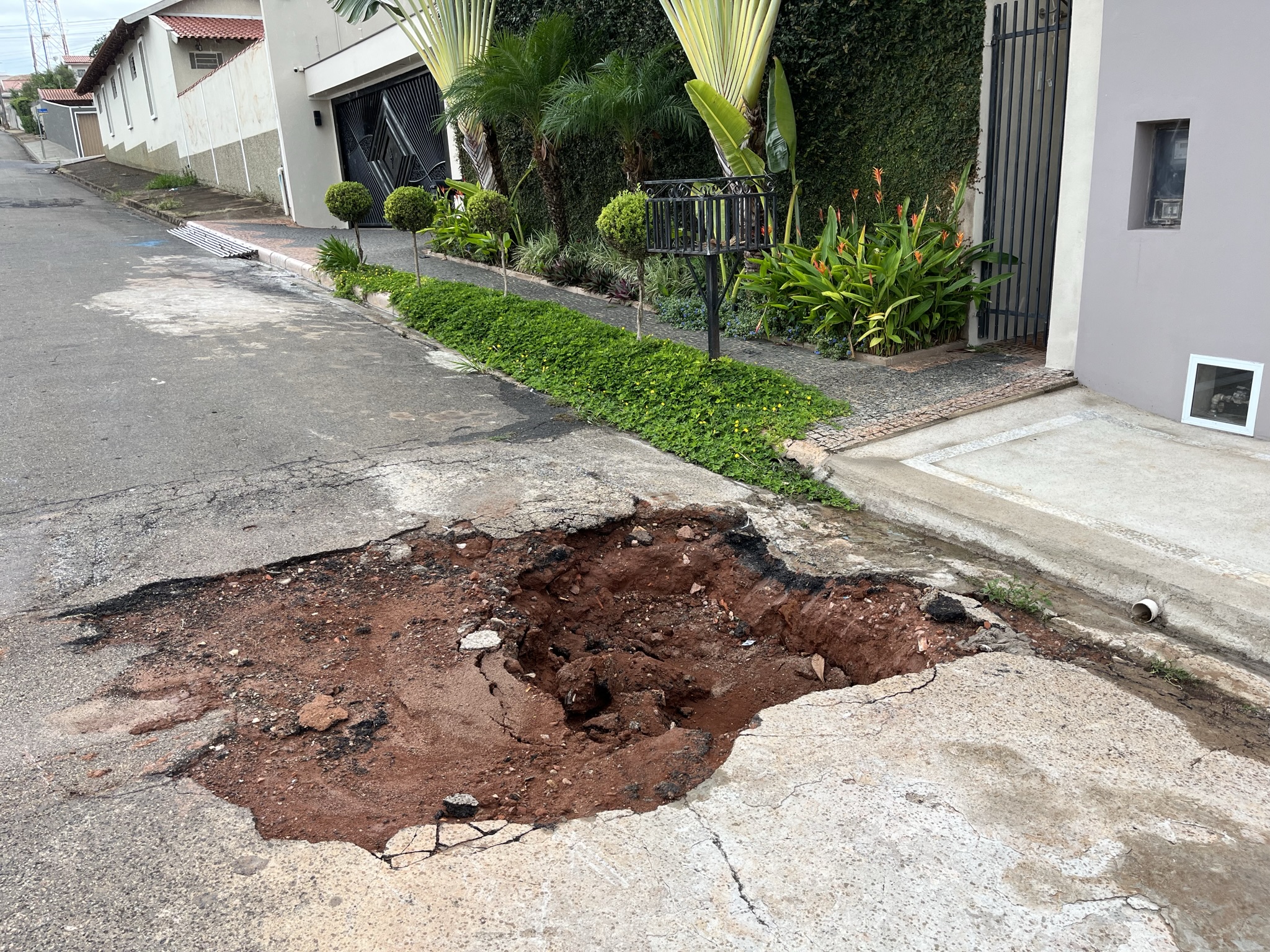 Com a chuva do final de semana, a terra foi levada embora e o buraco reabriu, restando uma cratera de mais de 70 cm de circunferência. Ela também informou que parte do meio-fio está quebrando, pois a terra debaixo da calçada está sendo carreada pela ação da chuva. A moradora teme que sua calçada comece a ceder e o problema aumentar.