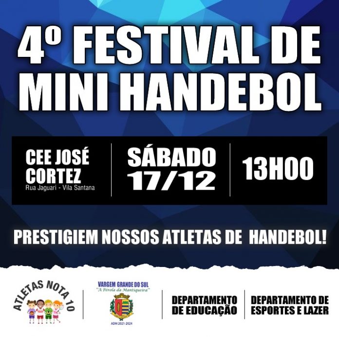 O Departamento de Esportes e Lazer da Prefeitura Municipal realizará o 4º Festival de Mini-Handebol, no próximo sábado, dia 17, no Centro Educacional Esportivo José Cortez, a partir das 13h.