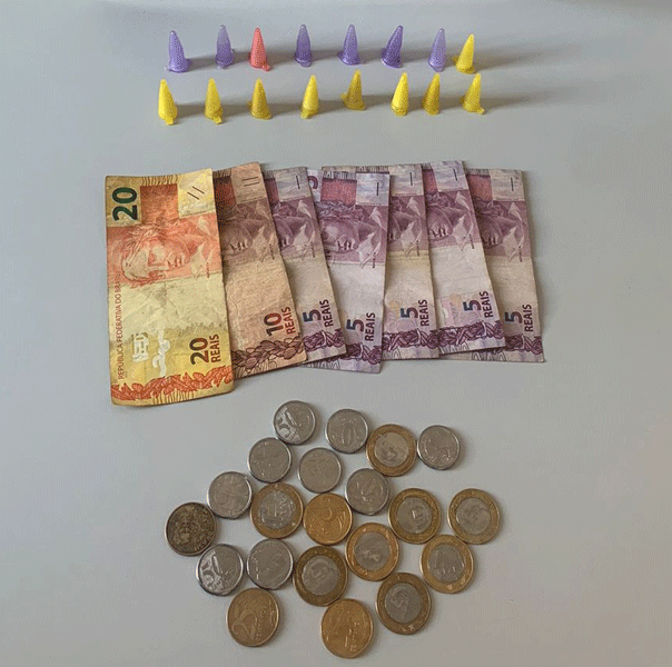 Em vistoria no local, foi localizado uma pequena bolsa com sete pinos de cocaína e nove pinos vazios, além de R$ 68,50 entre cédulas e moedas.