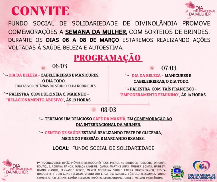 O Fundo Social de Solidariedade de Divinolândia promoverá, nesta semana, comemorações à Semana da Mulher, com sorteios de brindes. Entre segunda-feira, dia 6, e quarta-feira, dia 8, o Dia da Mulher, haverá ações voltadas à saúde, beleza e autoestima, na sede do Fundo Social de Solidariedade.