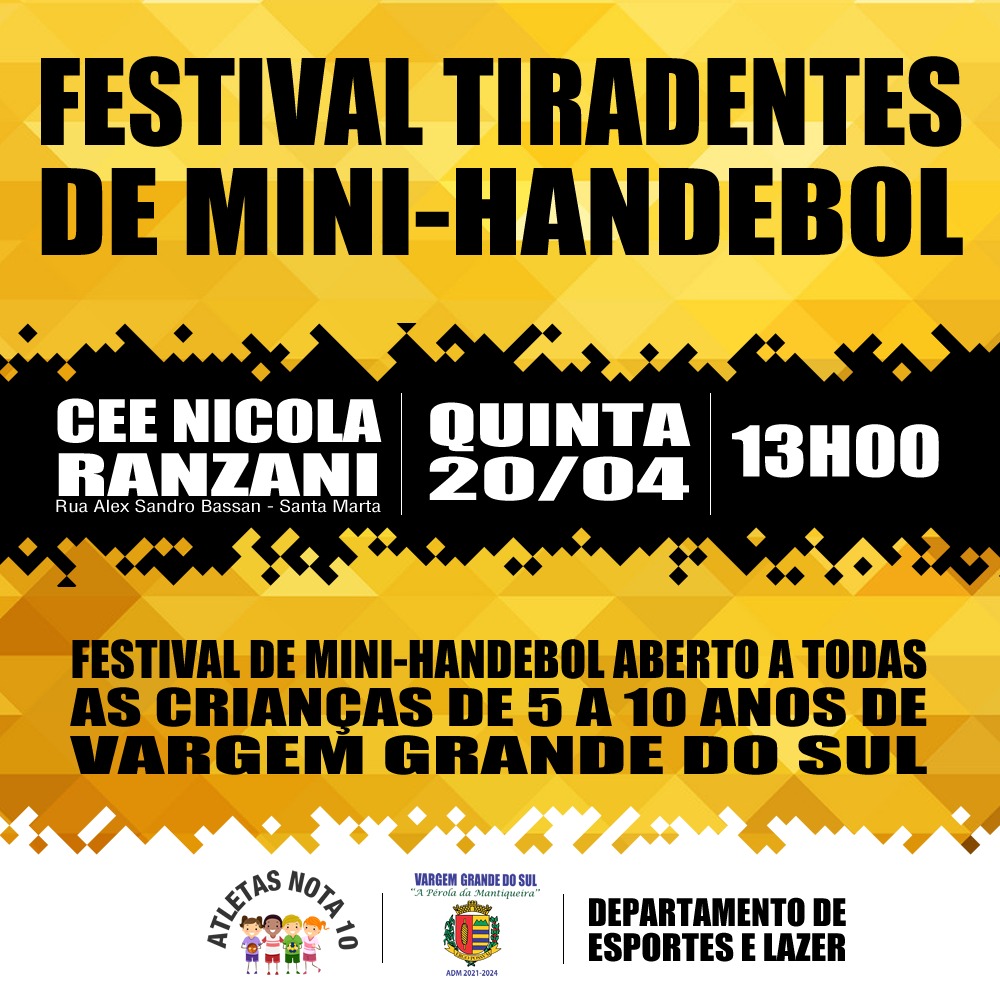 O Departamento de Esportes e Lazer realizará o Festival Tiradentes de Mini-Handebol em 20 de abril. Segundo a prefeitura, deverá contar com a participação de mais de 100 crianças matriculadas na modalidade pelo Projeto Atletas Nota 10 no Centro Educacional Esportivo Nicola Ranzani, no Jardim Santa Marta.