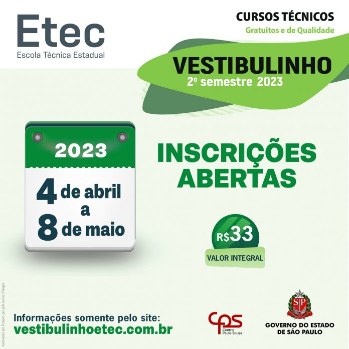 A Escola Técnica Estadual (Etec) de Vargem abriu as inscrições para o Vestibulinho do 2º Semestre de 2023 dos cursos gratuitos na terça-feira, dia 4. As inscrições devem ser realizadas pelo site www.vestibulinhoetec.com.br e seguem até 8 de maio, às 15h.