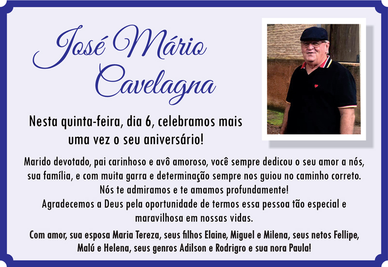 José Carlos Ferri, sócio proprietário do supermercado Estrela, aniversaria nesta segunda-feira, dia 10, recebendo os cumprimentos da esposa Silene, dos filhos Patrícia e Richard, do genro Lucas, da nora Patrícia, demais familiares e amigos. Foto: Arquivo Pessoal