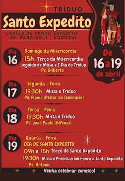 A partir deste domingo, dia 16, a Capela de Santo Expedito, no Jardim Paraíso II, fará uma programação especial em celebração ao Santo. O tríduo ao Santo Expedito tem início às 15h deste domingo, dia 16, com o Terço da Misericórdia seguido de missa, pelo padre Gilberto.