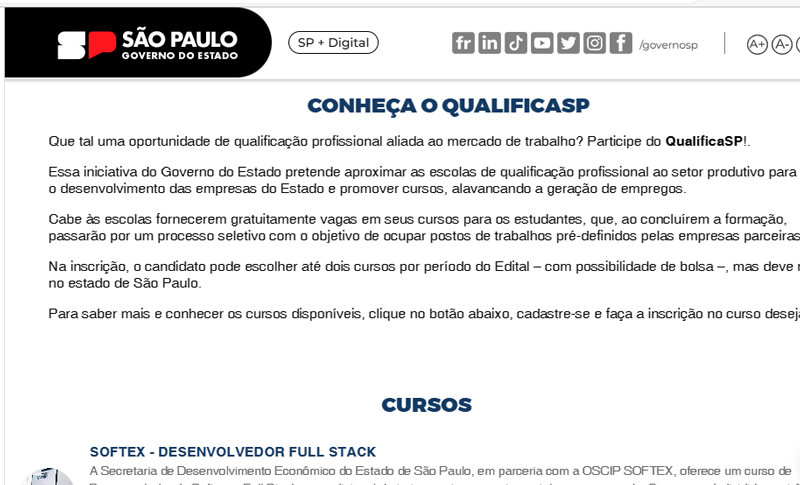 Os interessados em se inscrever nos cursos gratuitos e remotos, devem acessar o site www.desenvolvimentoeconomico.sp.gov.br/programas/qualificasp/.