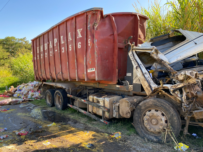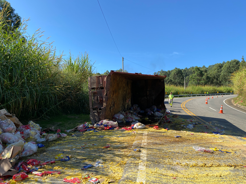 A curva da estrada de São Roque, altura do km 21, conhecida pelos acidentes que ali acontecem, foi local de mais um acidente nesta sexta-feira, dia 19, quando por volta das 12h30, um caminhão carregado com macarrão de descarte perdeu os freios, chocou-se com o guard rail e tombou na pista.