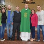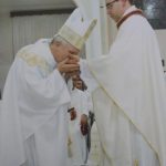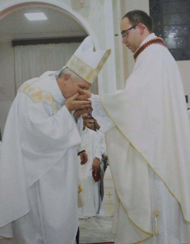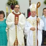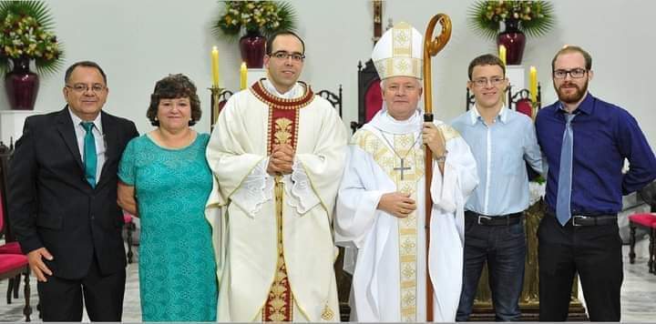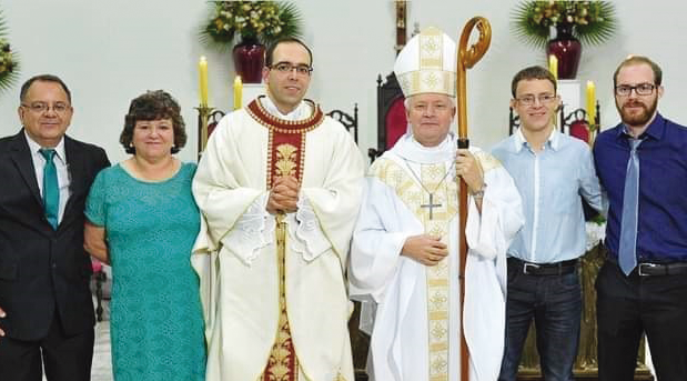 Padre Rogério, que está com a família, em sua ordenação com o Bispo Dom Antônio Emídio Vilar. Foto: Arquivo Pessoal