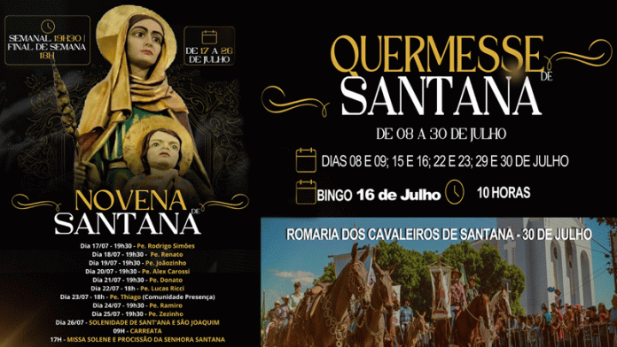 No dia 26, haverá a Solenidade de Sant’Ana e São Joaquim, com carreata às 9h. A Missa Solene e a Procissão da Senhora Sant’Ana serão às 17h.