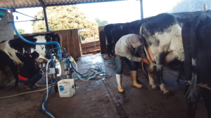 Os quatro membros da família tiram o leite na parte da manhã, cuja ordenha começa às 5h30 e termina por volta das 7h30 e na parte da tarde, com início às 15h e término às 18h. Contam para facilitar um pouco a tarefa, com a ordenhadeira mecânica e também tem tanque de resfriamento do leite, o que permite à família executar o serviço e não precisar contratar mão de obra.