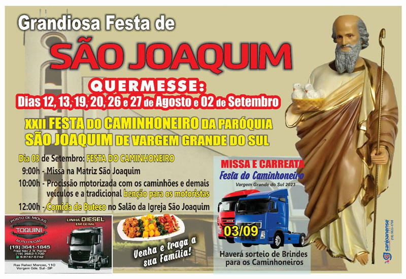 No domingo do dia 3 de setembro, será realizado a XXII Festa do Caminhoneiro da Paróquia de São Joaquim, com missa a ser celebrada na Igreja Matriz de São Joaquim, às 9h, depois às 10h, procissão motorizada com os caminhões e demais veículos e a tradicional benção para os motoristas. Ao meio-dia, haverá um especial almoço de “comida de buteco”, no salão da Igreja. Haverá ainda sorteio de brindes para os caminhoneiros.