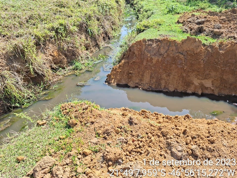 A equipe constatou os fatos, uma vez que havia desvio de dreno artificial e abertura de um novo canal para lançamento superficial no curso d’água, além do depósito da terra oriunda da escavação, sem autorização do órgão ambiental competente.