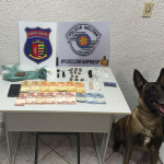 Os dois fugiram e apenas um foi pego. Nada de ilícito foi encontrado com ele, porém, o cão farejador encontrou um invólucro plástico com um tablet grande de maconha, pesando 0,073 kg, 20 porções de maconha já embaladas para a venda, pesando 0,044 kg, e 68 eppendorfs de cocaína, pesando 0,049 kg, onde a dupla estava.