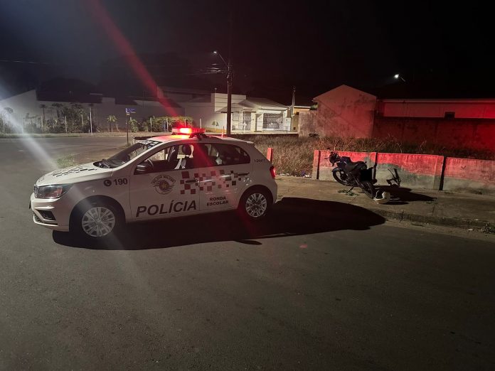 Durante patrulhamento na Vila Santana, a Polícia Militar viu uma motocicleta de cor azul. Ao receber ordem de parada, ele não acatou e aconteceu um breve acompanhamento. Nos cruzamentos das ruas Francisco Marti e Maria Gabon Strazza, o condutor se desequilibrou e caiu.