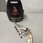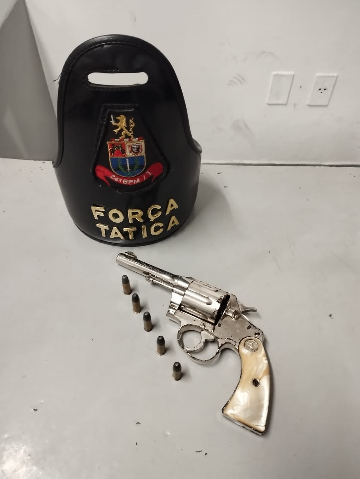 Em sua cintura, havia o armamento utilizado no crime com cinco munições intactas. A motocicleta e os objetos utilizados no crime foram apreendidos e o rapaz permaneceu preso à disposição da Justiça.