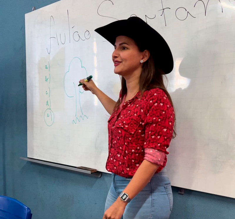 Na terça-feira, dia 28, a diretora da unidade, a professora Elaine Cristina Felipe Pinheiro, vestida como carteira, entregou cartas de incentivo à prova produzidas pelos familiares dos estudantes.