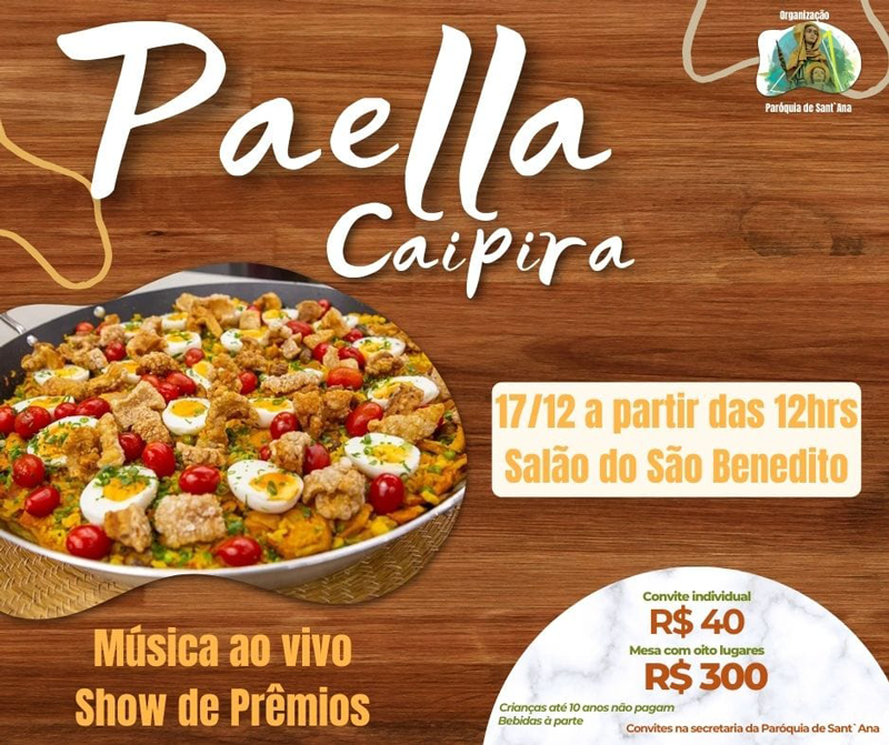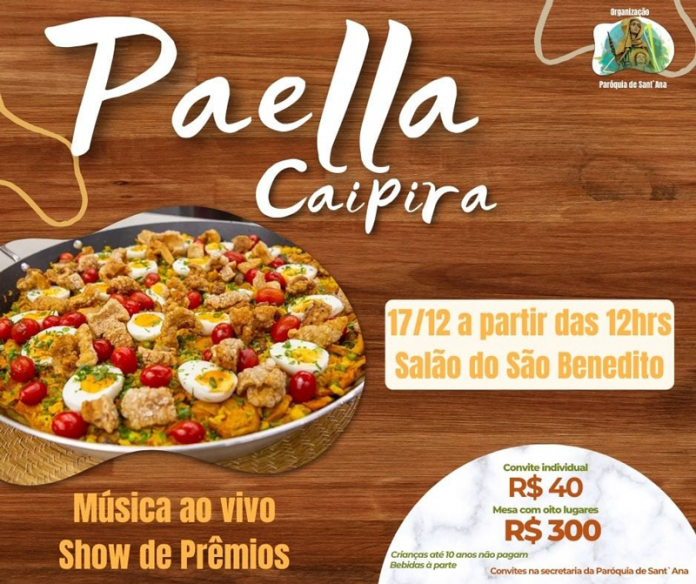Os convites podem ser adquiridos na secretaria da Paróquia Sant’Ana. Na ocasião, além da deliciosa paella caipira, haverá música ao vivo e show de prêmios.
